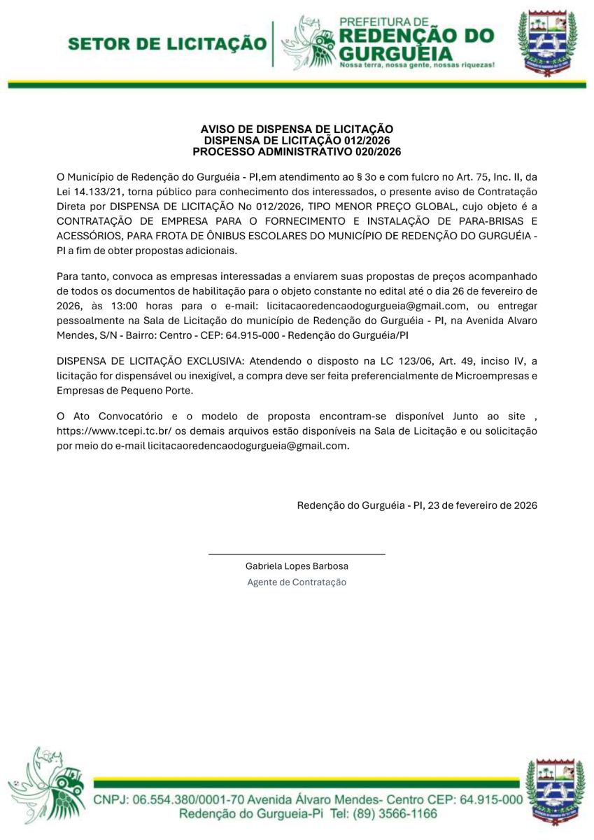 AVISO DE DISPENSA Nº 012/2026